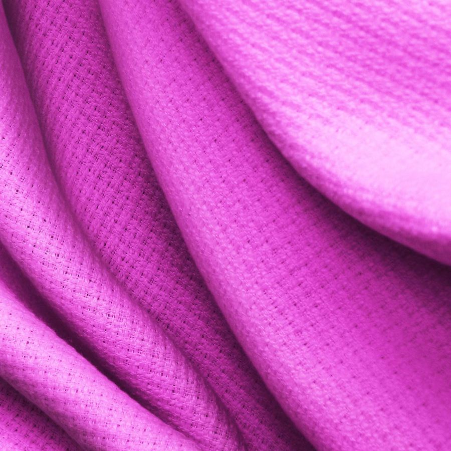 La Tweed - Chanel es una tela de tweed compuesta al 100% de poliéster con un gramaje de 420 gr/m2 y ancho de 150 cm. Su color liso impreso es un morado dinámico con un CMYK de 24 72 0 0, lo que significa que tiene un alto contraste y una intensidad de tonos muy llamativa. Este color es muy versátil y combina perfectamente con colores análogos como el rosa y el azul, así como con colores complementarios como el verde y el amarillo.