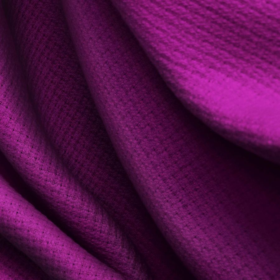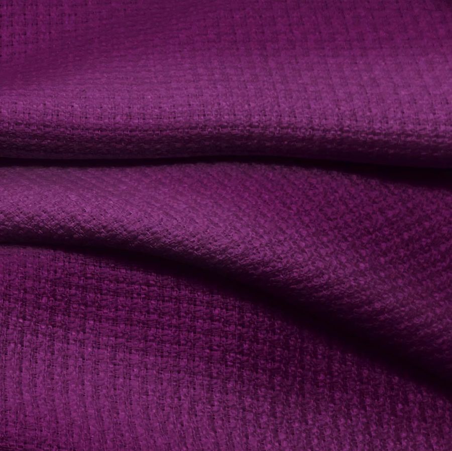 La tela base del tejido es Tweed - Chanel, de tipo tweed y compuesta al 100% por poliéster, con un gramaje de 420 gr/m2 y un ancho de 150 cm. El color liso impreso es de un tono morado o púrpura de tiro, según el CMYK de 70 100 33 47. Este color, con una tinta magenta especialmente alta junto a la tinta cyan, ofrece una combinación vibrante y llamativa que se podría mezclar con colores neutros como el gris, el blanco o el negro para lograr un efecto más equilibrado. Cabe destacar que el tejido está impreso con este color liso a una sola cara por impresión digital textil, lo que significa que solo un lado del tejido tendrá el color impreso.