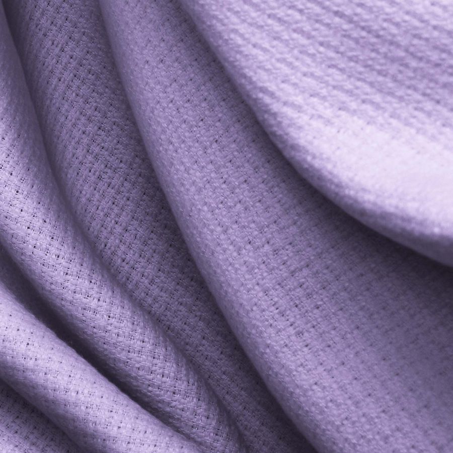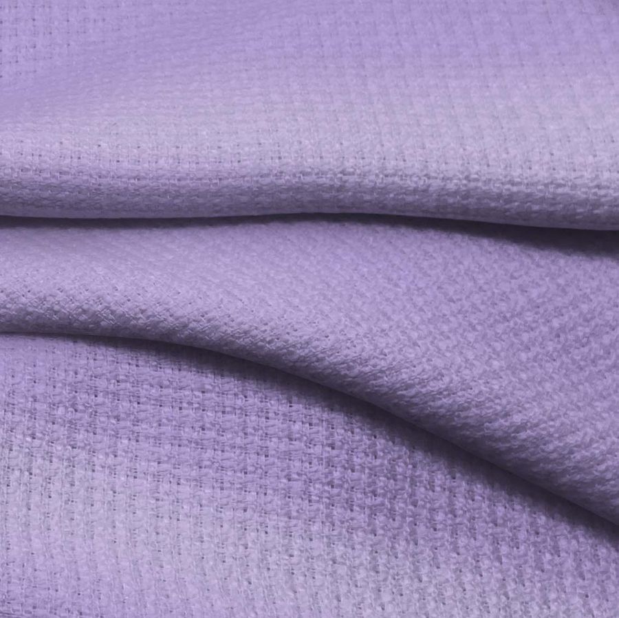 La tela base es el Tweed-Chanel, una tela de poliéster con un gramaje de 420 gr/m2 y un ancho de 150 cm. El color liso impreso es un hermoso tono de morado pastel ligero con un CMYK de 36 42 0 0, que le da una apariencia suave y acogedora. Este color simboliza la creatividad y la sabiduría y se combina perfectamente con colores como blanco, gris y rosa claro.