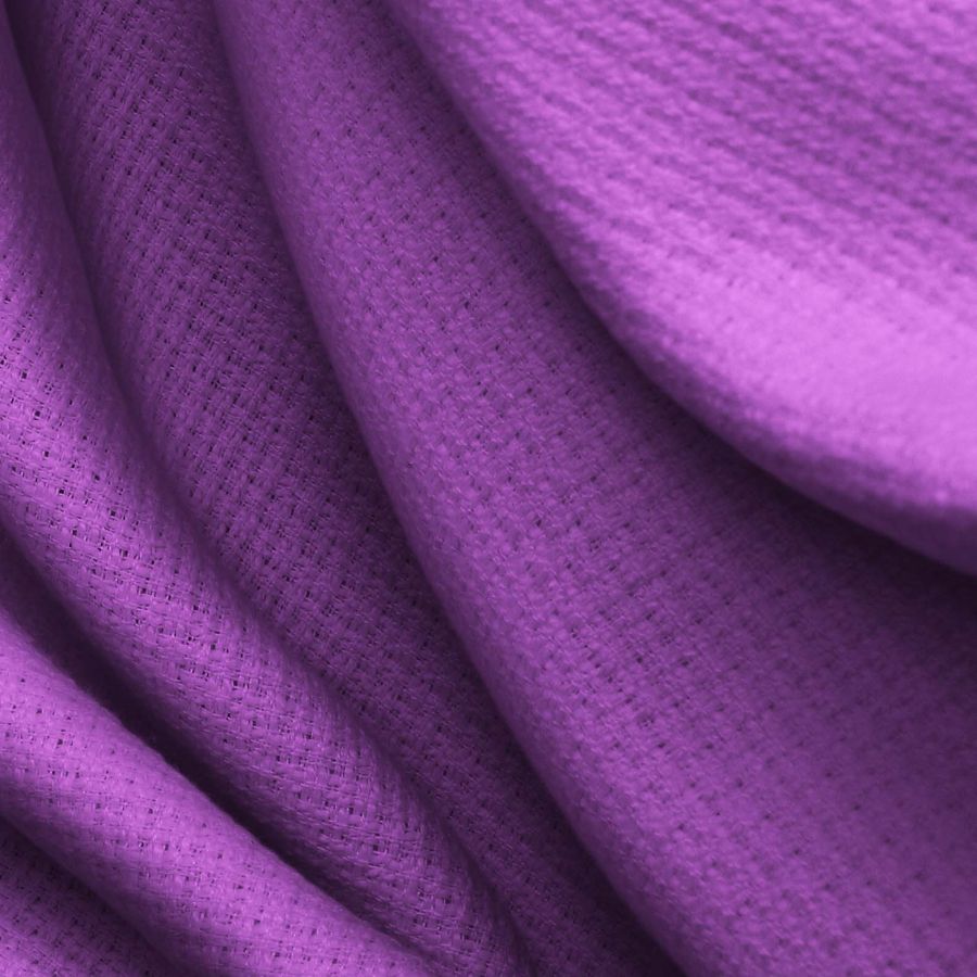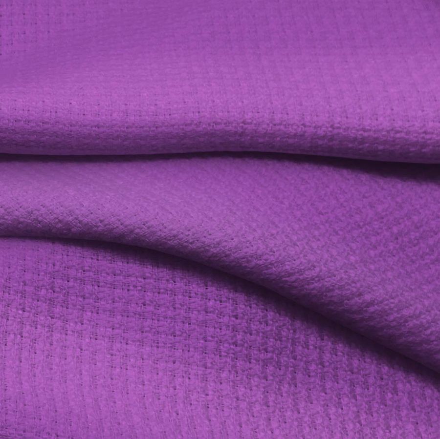 La tela base es un Tweed - Chanel de composición 100% poliéster, con un gramaje de 420 gr/m2 y un ancho de 150 cm. El color liso impreso presenta tonalidades de morado y purpúreo con un CMYK de 54 77 0 0. Este color secundario se caracteriza por ser enigmático, creativo y refinado, a la vez que misterioso y un poco nostálgico. El color impreso combina bien con tonos oscuros como el negro, el azul marino o el gris, así como con colores claros como el blanco y el crema.