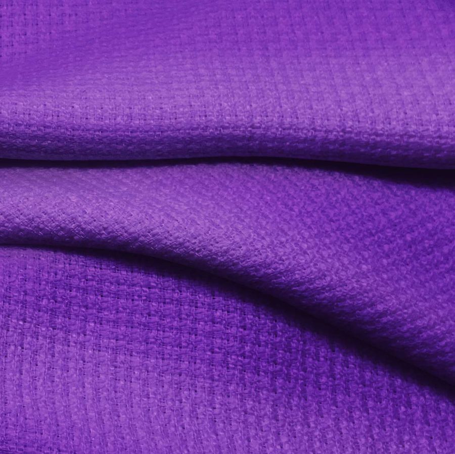 La tela base es un Tweed Chanel compuesto al 100% de poliéster, con un gramaje de 420 gr/m2 y un ancho de 150 cm. El color liso impreso es Morado Uva, con un CMYK de 75 87 0 0. El color secundario de Morado Uva evoca un matiz emocionalmente equilibrado y tranquilo, siendo una elección popular para la moda y el diseño de interiores. Además, se puede combinar perfectamente con colores grises, blancos y rosados, creando un ambiente fresco y elegante. Este tejido está impreso con el color liso a una sola cara por impresión digital textil, lo que permite la captura de los detalles más finos y precisos.
