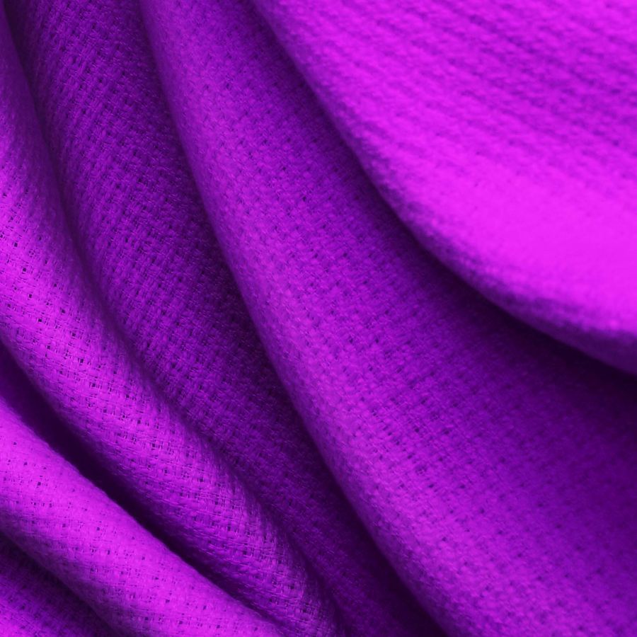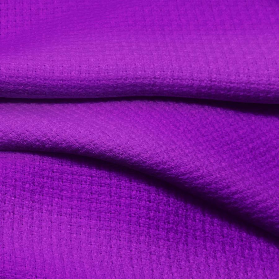 La tela base es Tweed - Chanel, de tipo Tweed y composición 100% POLIÉSTER. Su color liso Morado-Violeta Artístico tiene un CMYK de 69 91 0 0. Este color secundario evoca sensaciones de creatividad, sofisticación y elegancia. Combinado con el negro y el blanco, aporta un estilo moderno y minimalista. La tela está impresa con el color liso a una sola cara por impresión digital textil.