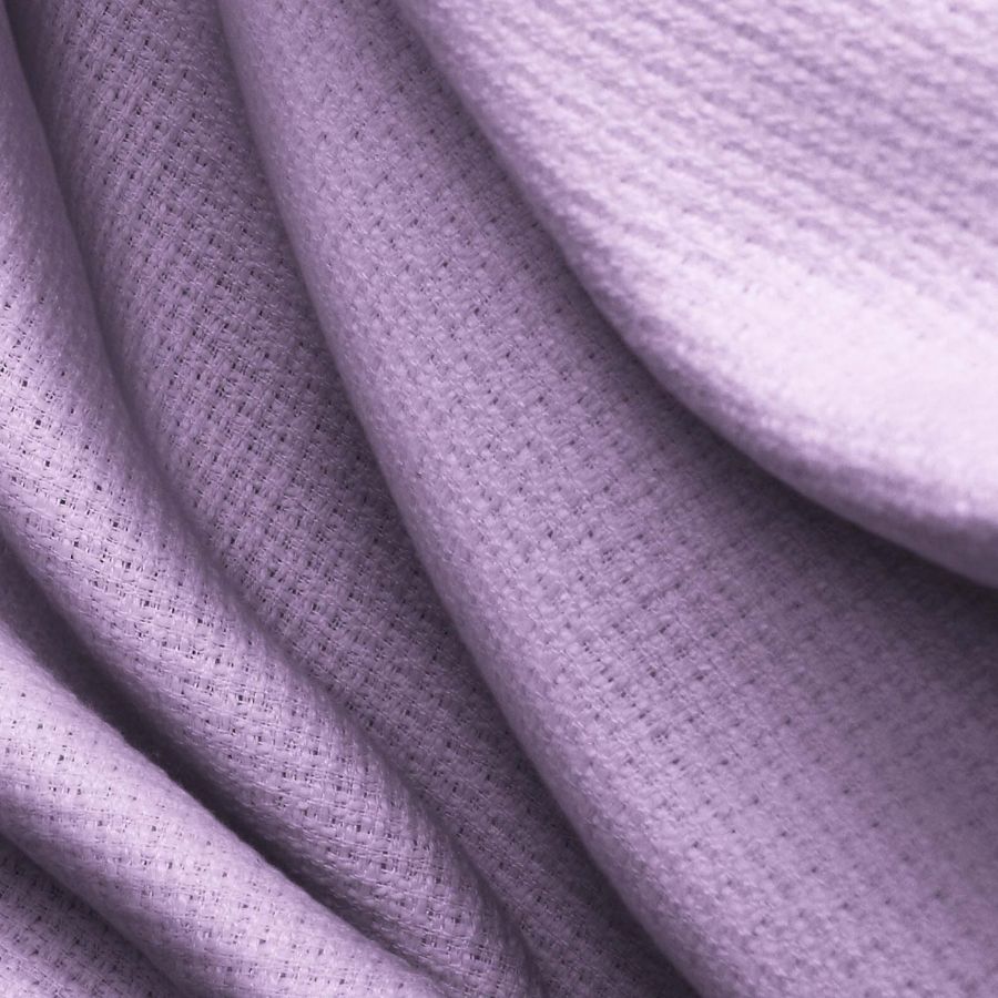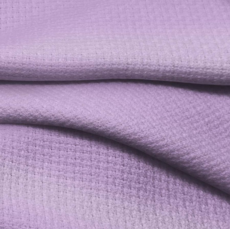 La tela base, Tweed-Chanel, es un tejido de tipo tweed con una composición 100% poliéster y un gramaje de 420 gr/m2. El color liso impreso tiene un tono morado-violeta claro, con una tinta cyan de 24, magenta de 39, yellow de 0 y black de 0, lo que se traduce en un valor CMYK de 24 39 0 0. Este color secundario refleja la tranquilidad y la paz, y combina perfectamente con tonos oscuros como el negro o el marrón, hablando de moda, mientras que en la decoración, es idóneo para combinar con el verde y el rosa. Se trata de un tejido impreso con un color liso a una sola cara mediante impresión digital textil.