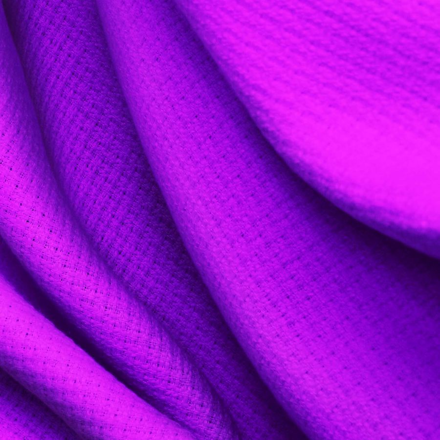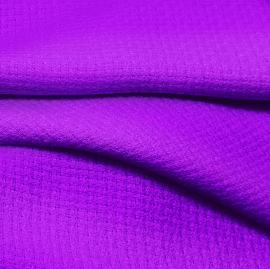 La tela base es un tweed de poliéster con un gramaje de 420 gr/m2 y un ancho de 150cm. El color liso impreso es de un Morado vivid violeta con una composición de CMYK de 72 81 0 0. El color secundario es un tono vibrante y sofisticado que se asocia con la creatividad y la individualidad. Combinado con blanco, gris o negro, puede crear looks atractivos y elegantes. El tejido está impreso con una sola cara mediante impresión digital textil. La tela base tiene una textura rígida al tacto. Es adecuada para prendas de alta calidad como chaquetas, abrigos, faldas, vestidos, cazadoras y chalecos, así como para accesorios y hogar como cojines. Los cuidados recomendados son lavado a máquina con temperatura máxima de 30°C, no usar lejía, no secar en secadora, y planchar a temperatura baja. La tecnología de impresión utilizada es la sublimación de poliéster. Este proceso de impresión utiliza tintas especiales que se evaporan a altas temperaturas para impregnar el tejido con el color deseado. Este método garantiza que la tela sea resistente al desgaste y que el color no se desvanezca con el uso y el lavado.
