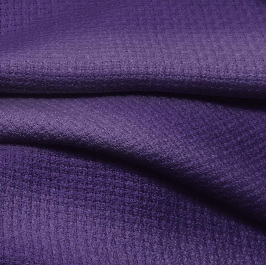 La tela base es el Tweed - Chanel, una tela de tweed con una composición del 100% de poliéster, con un gramaje de 420 gr/m2 y un ancho de 150 cm. El color liso que se imprime en esta tela es Morado-Violeta Ultramar, con los siguientes valores CMYK: 88 94 29 24. Este color secundario es simbólicamente asociado a la tranquilidad, la introspección y la calma interior, pero también puede proyectar un aire moderno y sofisticado. Este color combina a la perfección con tonos de rosa, rosa oscuro, gris, blanco y negro.