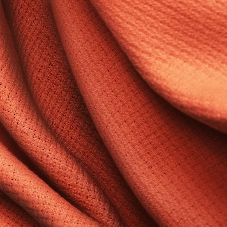 Es importante destacar que el tejido está impreso con color liso a una sola cara, utilizando impresión digital textil. La tela base es rígida al tacto y presenta una textura interesante. Combina perfectamente con colores entonados como el beige, el marrón y el dorado, que resaltan la profundidad y riqueza del color Ladrillo Refractario en particular.