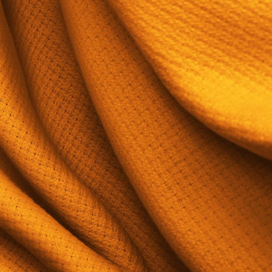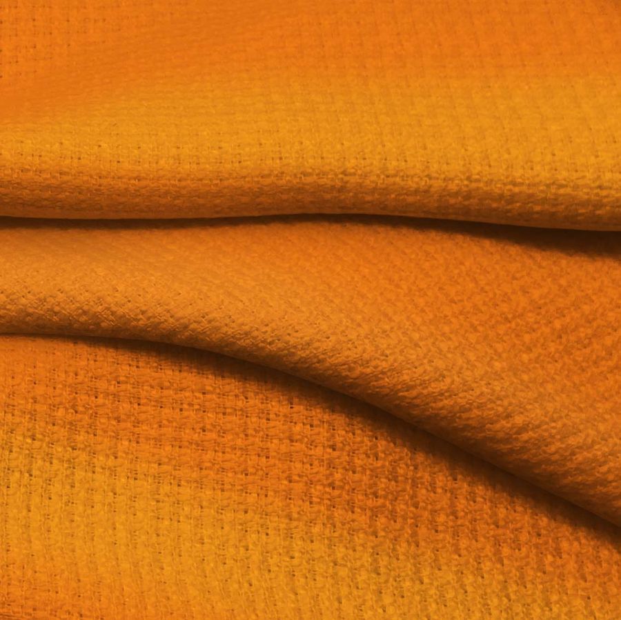 La tela base es Tweed - Chanel, compuesta al 100% de poliéster, con un gramaje de 420 gr/m2 y un ancho de 150 cm. El color liso impreso es naranja cangrejo, con el siguiente CMYK: 0 64 91 0. Este color simboliza la vitalidad y el optimismo. Las características de la tela incluyen una textura rígida y un tacto robusto. El color impreso combina bien con tonalidades terrosas como el marrón o el beige, y con tonos de azul verdoso. El tejido está impreso a una sola cara por impresión digital textil.