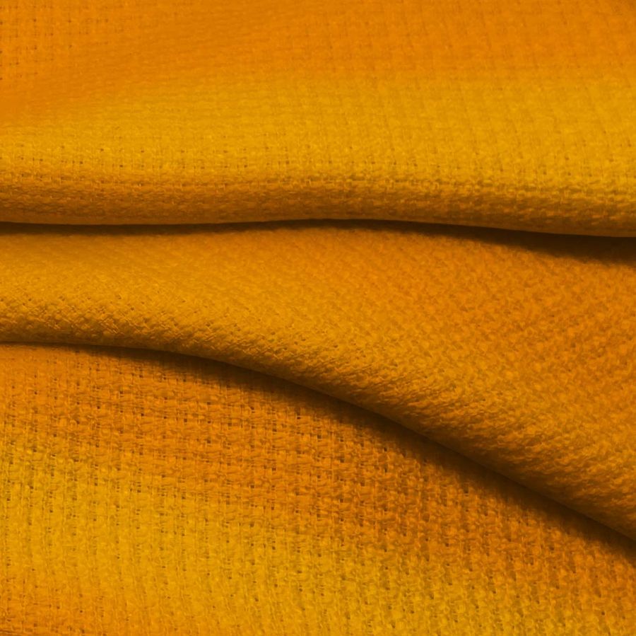 La tela base del tejido es un Tweed Chanel compuesto por 100% poliéster de 420 gr/m2, con un ancho de 150 cm y cuidados específicos que incluyen lavado a no más de 30°C, no blanquear ni secar en secadora. Este tejido es adecuado para la confección de prendas y accesorios tanto para mujer como para hombre, para el hogar y para la decoración exterior. El color liso impreso es un Naranja de Seguridad con un CMYK de 0 60 99 0. Este color combina muy bien con tonos neutros como el blanco y los grises, así como con otros tonos oscuros como el negro y el azul marino.