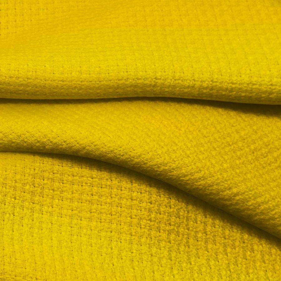 La tela base es el Tweed - Chanel, un tejido de tipo tweed compuesto al 100% por poliéster con un gramaje de 420 gr/m2 y un ancho de 150 cm. Su color liso impreso es naranja fluorescente, cuyos valores de CMYK son 0 25 94 0. Este color ofrece una simbología de vitalidad, creatividad y entusiasmo, transmitiendo una energía positiva. El naranja combina bien con otros colores cálidos como el amarillo, rojo y rosa, así como con tonos más fríos como el gris y el negro.