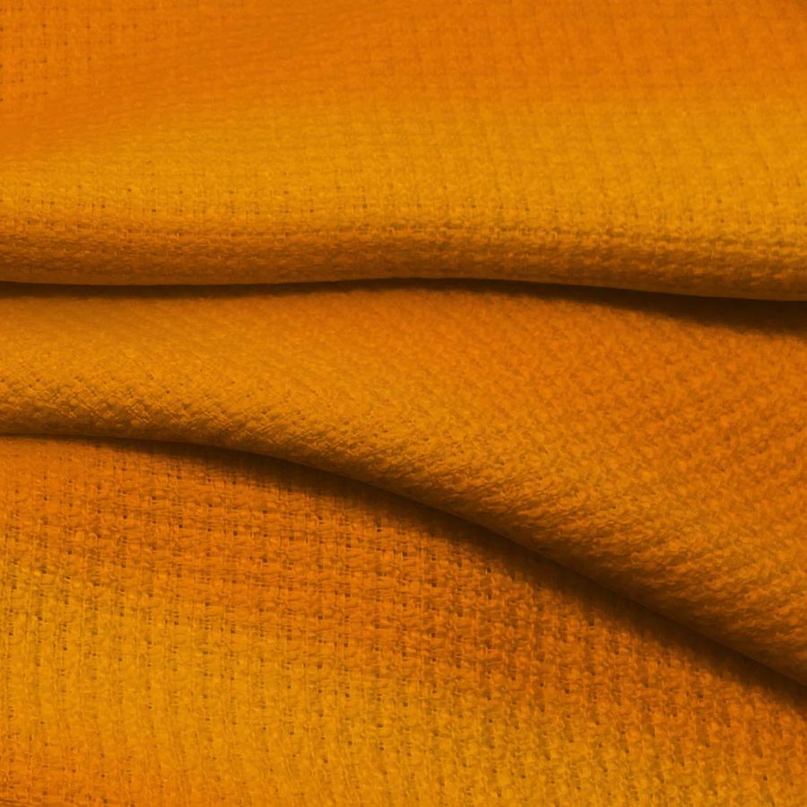 La tela Tweed - Chanel, de composición 100% poliéster, presenta un color liso impreso en tonalidad naranja con una fuerza de voluntad que se refleja en el CMYK 1 65 99 0. Este color, simbólicamente, representa la energía y la determinación. Técnicamente, se trata de un color intenso con tonalidades anaranjadas que combina muy bien con otras tonalidades cálidas como el marrón y el beige.