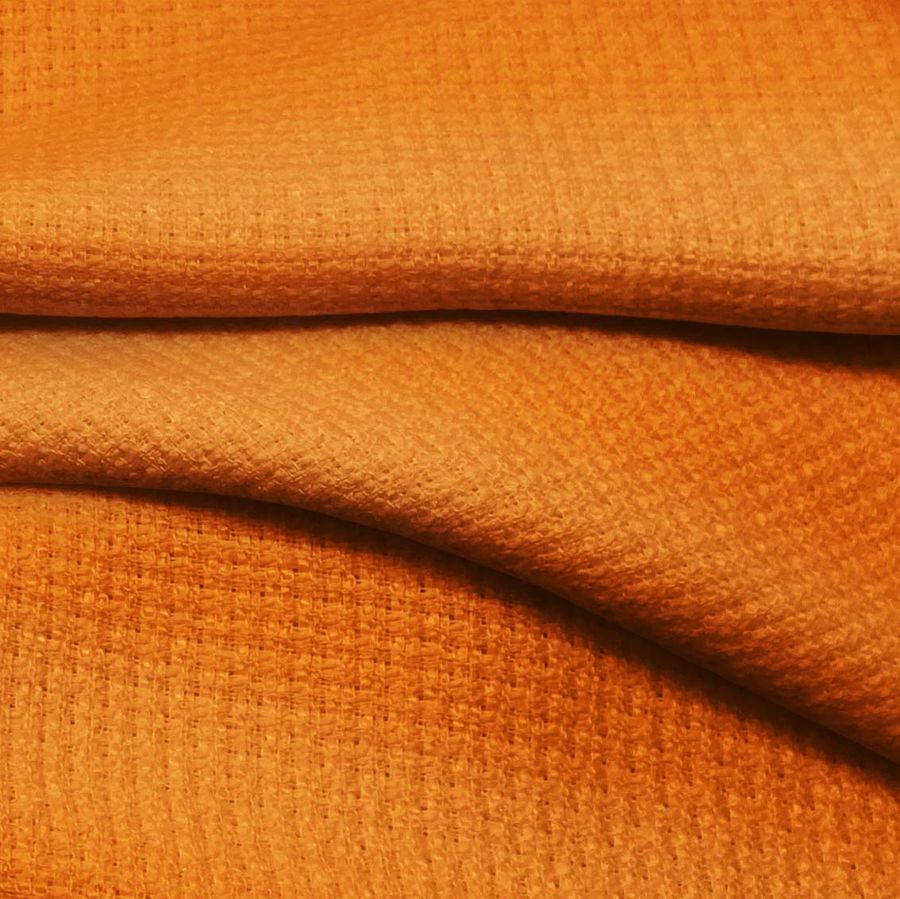 La tela base es un Tweed Chanel de 100% poliéster con un gramaje de 420 gr/m2 y un ancho de 150 cm. El color liso impreso en la tela base es Naranja Aeroespacial, con un CMYK de 0 69 100 0. Este color simboliza el optimismo, la creatividad y la innovación. Además, combina muy bien con colores neutros como el gris, el blanco y el negro, y también con tonos dorados o plateados.