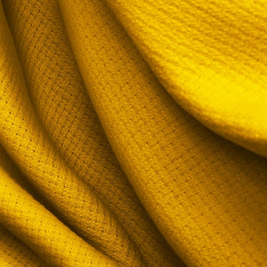 La tela base es un Tweed - Chanel compuesto por 100% POLIÉSTER con un gramaje de 420 gr/m2 y un ancho de 150 cm en un tono naranja oscuro, reflejado con un CMYK de 0 45 96 0. Este color evoca la energía y la pasión, además de ser un color muy versátil que combina bien con tonos tierra, negros o blancos. La tela está impresa con color liso a una sola cara por impresión digital textil, lo que permite detallar y definir los diseños en alta calidad.
