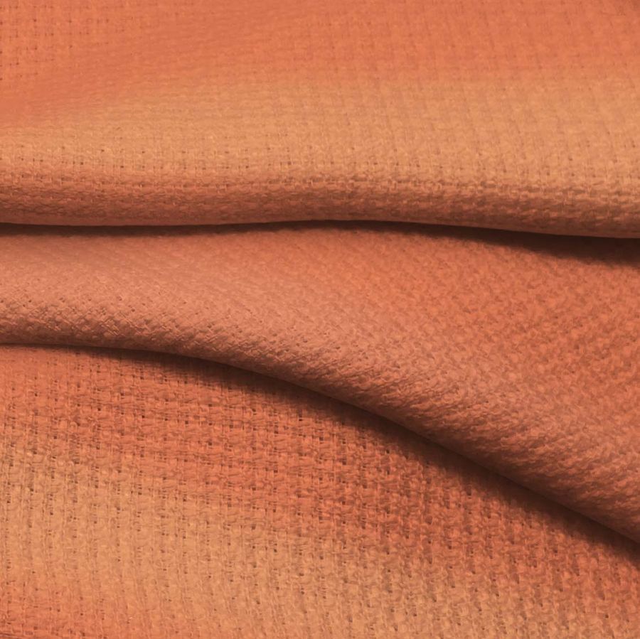 La tela base del Tweed Chanel es un tejido de poliéster rígido con un gramaje de 420 gr/m2, perfecto para la confección de prendas de moda y accesorios. El color liso impreso es un hermoso tono naranja, inspirado en las puestas de sol, con un CMYK de 1 63 67 0 y una textura agradable al tacto. Este color simboliza la vitalidad, el entusiasmo y la energía, y combina perfectamente con tonos neutros como el negro, el blanco y el gris, creando una paleta armoniosa y elegante.
