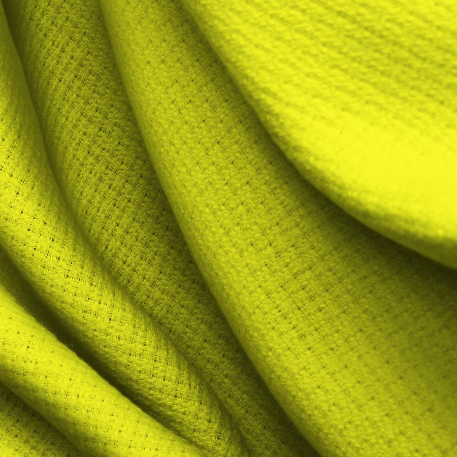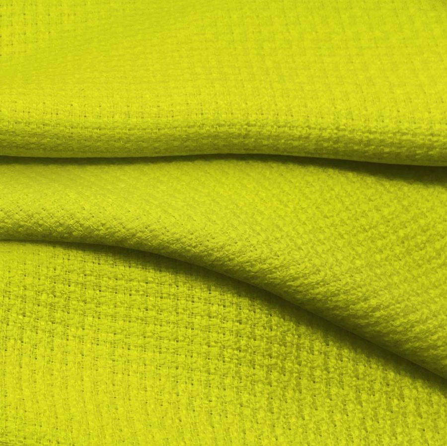 La tela base es el Tweed - Chanel, un tejido tipo tweed de poliéster con un gramaje de 420 gr/m2 y un ancho de 150 cm. En cuanto al color liso impreso, este es de un vibrante amarillo absenta, según el CMYK de 22 0 89 0. Este color es una combinación de amarillo y verde con fuertes matices de verde lima. Combina muy bien con tonos neutros como el blanco, el gris y el beige, así como con otros tonos verdes y amarillos.
