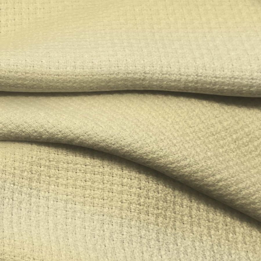 La tela base es Tweed-Chanel, un tejido de poliéster con un gramaje de 420 gr/m2 y un ancho de 150 cm. El color liso impreso es amarillo albumen, con un CMYK de 4, 8, 43, 0. Este color secundario es especialmente vibrante y atractivo, al presentar un matiz amarillo apagado con sutiles tonos de gris. Combina perfectamente con tonos neutros, y en particular con blancos, cremas y grises.