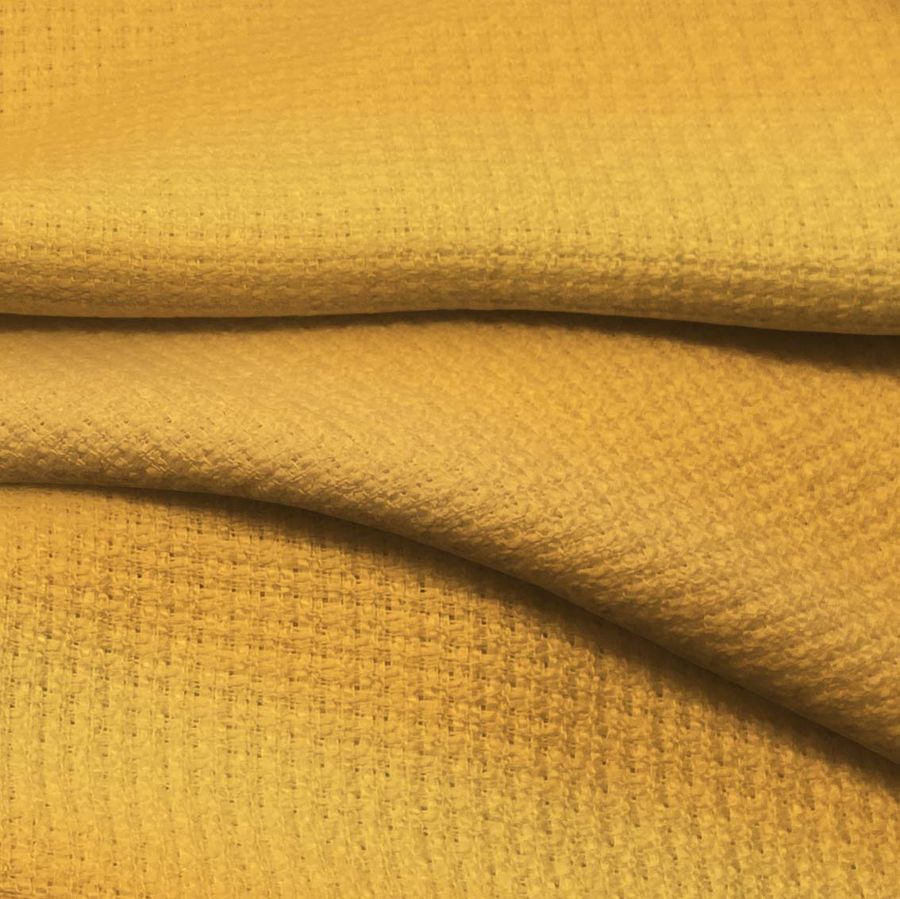 La tela base conocida como tweed chanel es un tejido de poliéster de alta calidad con un gramaje de 420 gr/m2 y un ancho de 150 cm. Se presenta en tonos neutros y rígidos al tacto, lo que lo convierte en un tejido resistente y duradero. El color base impreso es una combinación de amarillo y anaranjado, con una intensidad de tinta cyan de 0, tinta magenta de 38, tinta yellow de 78 y tinta black de 0, con un CMYK de 0 38 78 0. Este color secundario representa el optimismo, la energía y la creatividad, y combina a la perfección con tonos oscuros como el azul marino y el gris, y tonos neutros como el blanco y el beige.