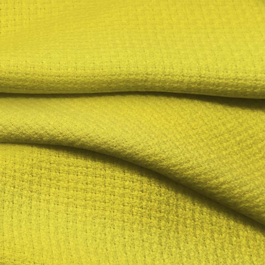 La tela base es un Tweed - Chanel de composición 100% poliéster, con un gramaje de 420 gr/m2 y un ancho de 150 cm. El color liso impreso es Amarillo Azufre, con un contenido de tinta de CMYK 10 6 84 0. Este color amarillo es simbólicamente asociado con la alegría y la vitalidad, y técnicamente, es un color primario y cálido que se puede combinar con tonos neutros como el blanco, el gris y el negro, así como con tonos complementarios como el azul y el verde.