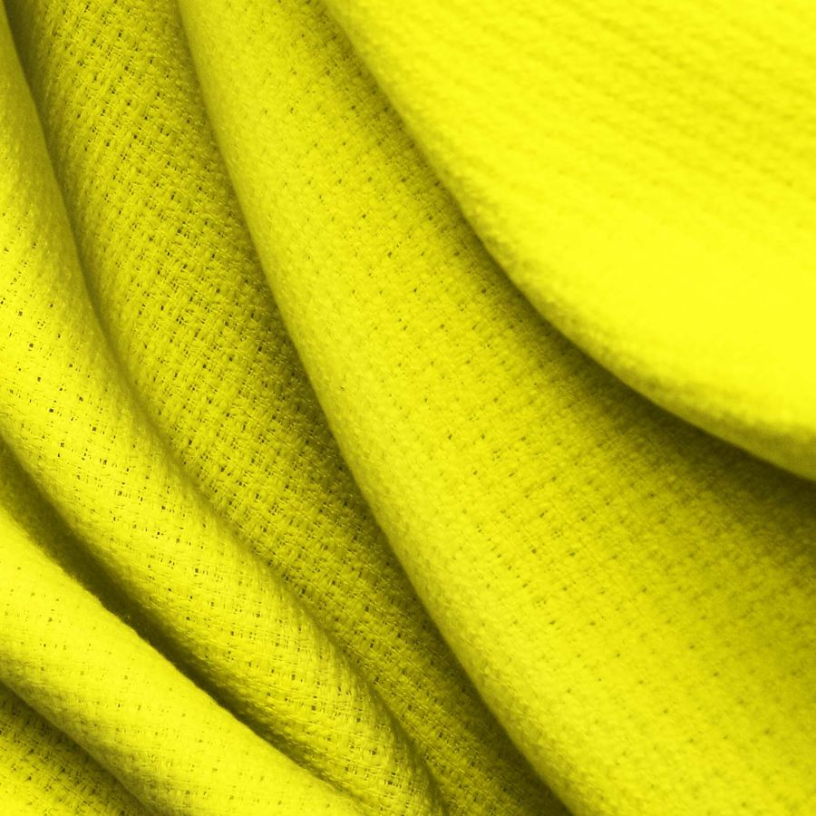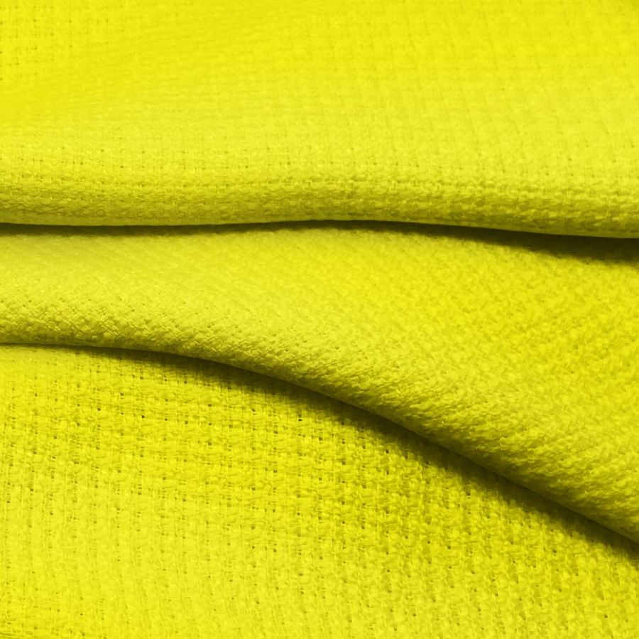 La tela base de este tejido es el Tweed – Chanel, compuesta al 100% por poliéster y con un gramaje de 420 gr/m2. Su ancho es de 150 cm y tiene un color base liso impreso en amarillo de cadmio, con un CMYK de 8 0 88 0. Este color se caracteriza por ser alegre, vivo y lleno de energía, simbolizando la felicidad y el optimismo. La combinación perfecta para este color es con otros tonos brillantes como el rojo y el naranja, así como también con tonos fríos como el gris y el negro.