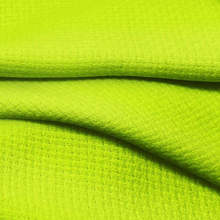 La tela Tweed - Chanel es un tejido de poliéster con un gramaje de 420 gr/m2 y un ancho de 150 cm. El color liso impreso es un verde pistacho con una mezcla de tinta Cyan del 35%, tinta Yellow del 100%, tinta Magenta del 0%, y tinta Black del 0%, dando como resultado un CMYK de 35 0 100 0. Este color es simbólicamente fresco y natural, y técnicamente vibrante y llamativo. Combina perfectamente con tonos tierra como el beige, marrón y crema, así como también con tonos más brillantes como el fucsia y el turquesa.