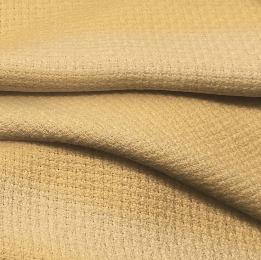 La tela base es una tweed de Chanel compuesta al 100% por poliéster, con un gramaje de 420 gr/m2 y un ancho de 150 cm. El color liso impreso es un amarillo macarrón con una CMYK de 0 27 58 0. Es un color vibrante y lleno de energía que aporta frescura y dinamismo a cualquier prenda o decoración. Este color se combina perfectamente con otros tonos cálidos como el rojo o el naranja, y también con tonos más neutros como el blanco o el gris.