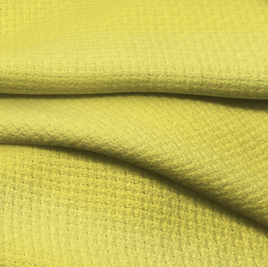 La tela base es un tweed de poliéster con un gramaje de 420 gr/m2, con un ancho de 150 cm y está compuesta al 100% de poliéster. El color liso impreso es un Amarillo Maíz con una combinación CMYK de 5,0,73,0. Este color da una sensación de calidez, alegría e iluminación. Combina muy bien con colores como el amarillo claro, el blanco, el marrón y el gris. Es importante destacar que el tejido está impreso con el color liso a una sola cara por impresión digital textil, lo que significa que la tinta está penetrando en las fibras del tejido.