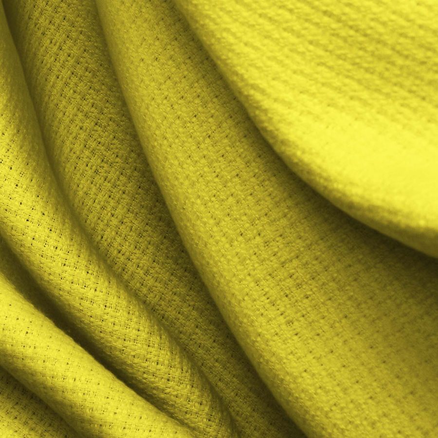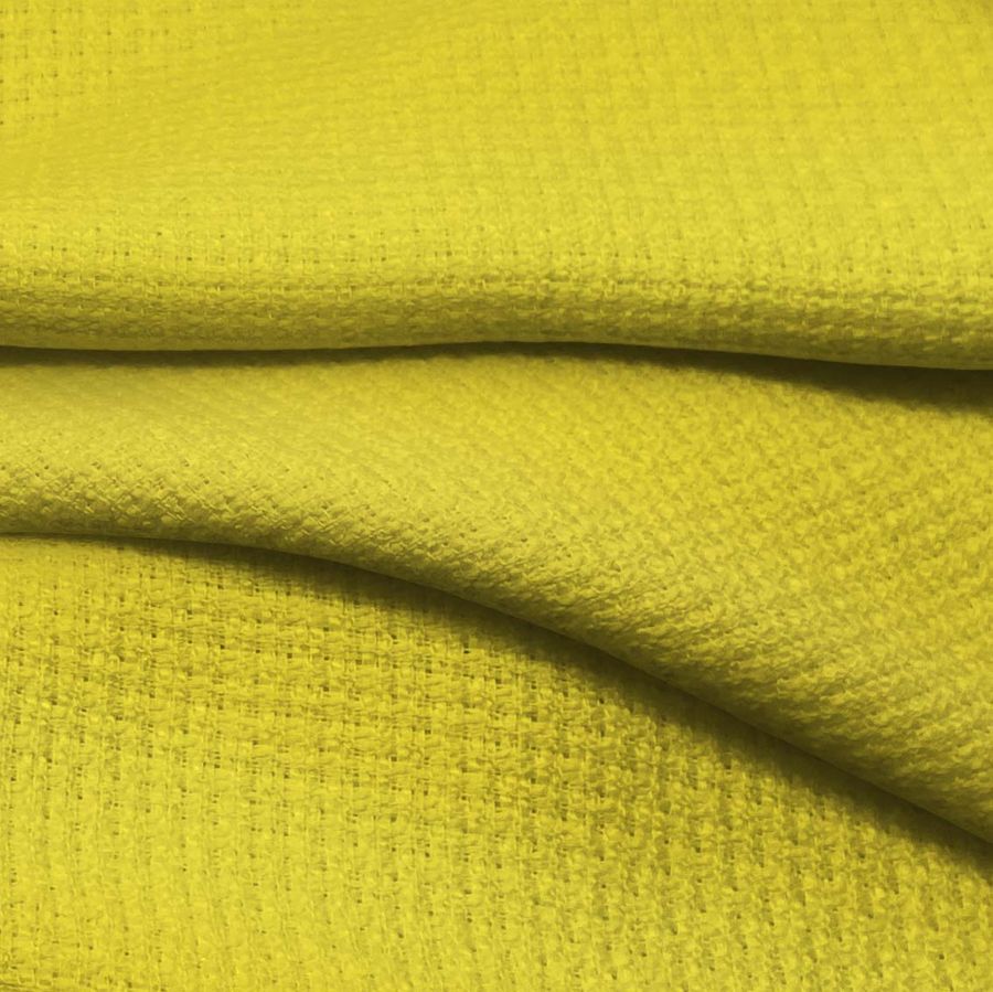La tela base es el Tweed - Chanel, con una composición de 100% poliéster, un gramaje de 420 gr/m2 y un ancho de 150 cm. El color liso impreso en la tela es el amarillo membrillo, con una tinta cyan de 11, una tinta magenta de 10, una tinta yellow de 86 y una tinta black de 0, con un CMYK de 11 10 86 0. Este color es un tono cálido que representa la alegría y la luminosidad del sol. Combinado con tonos neutros como el blanco, el negro y el beige, logra un contraste armónico y elegante.