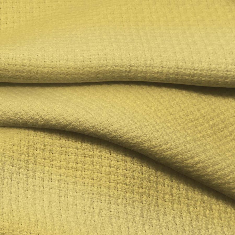 La tela base, Tweed - Chanel, es un tejido de poliéster con un gramaje de 420 gr/m2 y un ancho de 150 cm. Su color liso impreso es Amarillo Nápoles, con una composición de tintas CMYK de 10 18 67 1. Este tono secundario ilumina con su amarillo dorado y tierno, evocando la energía de la luz del sol. Se puede combinar perfectamente con tonalidades pastel como el rosa, el malva y el celeste, así como con tonos tierra como el marrón y el beige.
