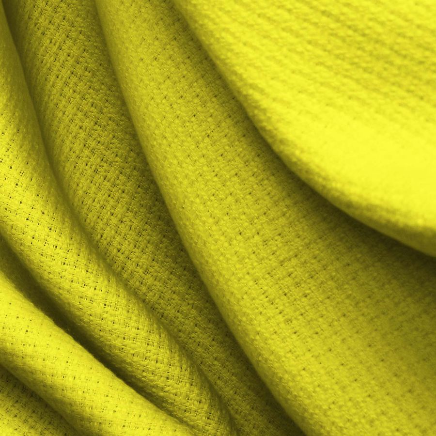 La tela base es Tweed - Chanel, 100% poliéster, con un gramaje de 420 gr/m2 y un ancho de 150 cm. El color liso impreso es Amarillo Neón, con un CMYK de 7 0 85 0. Este color vibrante evoca la energía, la felicidad y la frescura. Es un color que combina bien con tonos neutros como blanco, negro, gris y azul. La tela impresa a una sola cara por impresión digital textil. La textura es rígida al tacto, lo que le confiere una mayor presencia y estabilidad.