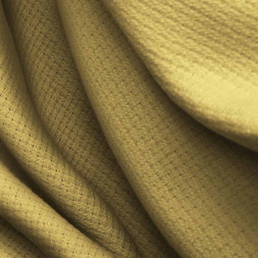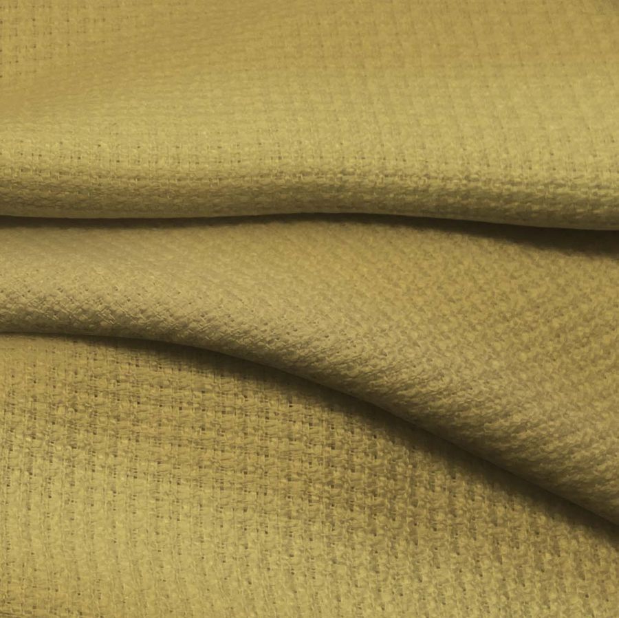 La tela base de este producto es un Tweed - Chanel compuesto 100% de poliéster, con un gramaje de 420 gr/m2 y un ancho de 150 cm. El color liso impreso en la tela es Amarillo Oro, el cual está compuesto por una mezcla de Cyan (27), Magenta (32), Yellow (73) y Black (12) que sumados en escala CMYK dan como resultado el 27 32 73 12. Este color es vibrante y alegre, evocando el optimismo y la felicidad. En combinación con otros tonos de amarillo, beige y blanco denota un estilo moderno y sofisticado.