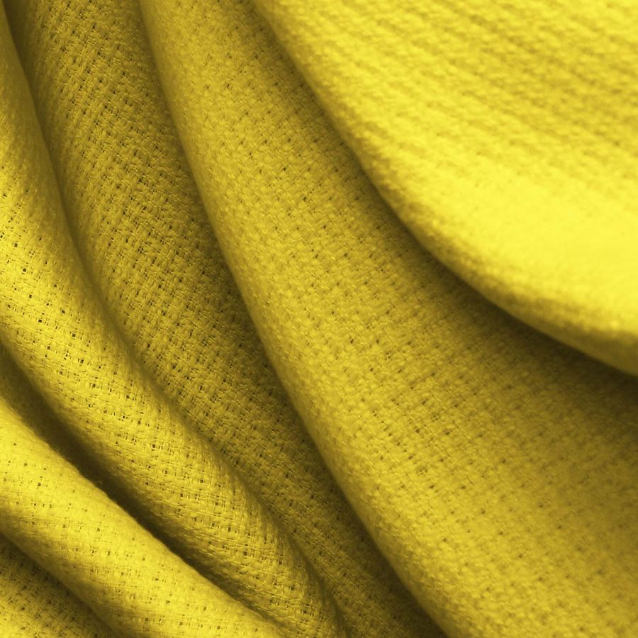 La tela base es el Tweed de Chanel, compuesto por 100% poliéster y con un gramaje de 420 gr/m2. El color liso impreso en esta tela es amarillo postal, con una mezcla de 1% de tinta cian, 17% de tinta magenta, 85% de tinta amarilla y 0% de tinta negra, reflejando un aspecto vivo y luminoso. Este color simboliza la alegría y el optimismo, evocando la sensación de un día soleado. El amarillo postal se combina perfectamente con colores neutros como el gris y el negro, así como con otros tonos brillantes como el rojo y el verde.