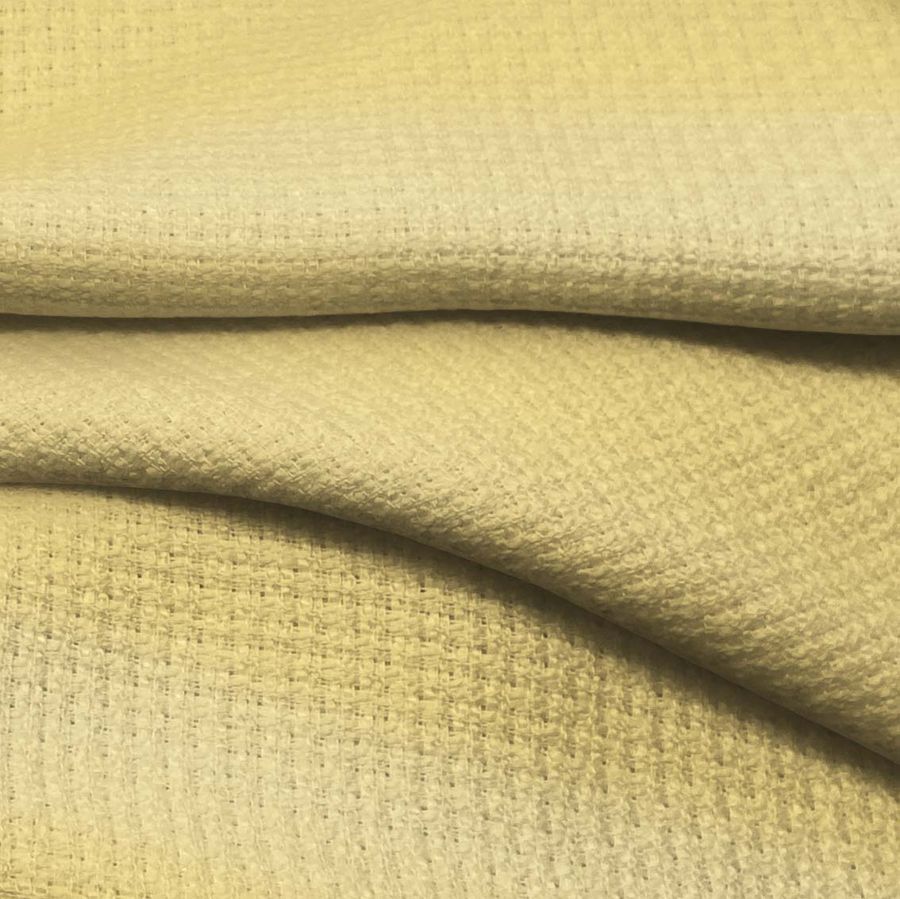 La tela base es el Tweed - Chanel, una tela de tipo tweed hecha con 100% poliéster, con un gramaje de 420 gr/m2 y un ancho de 150 cm. El color liso impreso es el Amarillo Té, con una tinta cyan del 0, magenta del 12, yellow del 56 y black del 0, lo que da un CMYK de 0 12 56 0. Este color secundario es ideal para darle un toque vibrante a cualquier prenda o accesorio. Combina particularmente bien con gris, negro, blanco, marrón y azul marino.