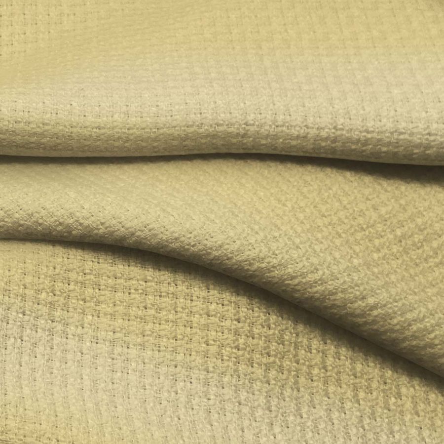 La tela base de este tejido es el Tweed - Chanel, un tejido de tipo Tweed con una composición del 100% POLIÉSTER, con un gramaje de 420 gr/m2 y un ancho de 150 cm. El color liso impreso es amarillo viejo, con un CMYK de 12 17 54 1, impreso a una sola cara por impresión digital textil.