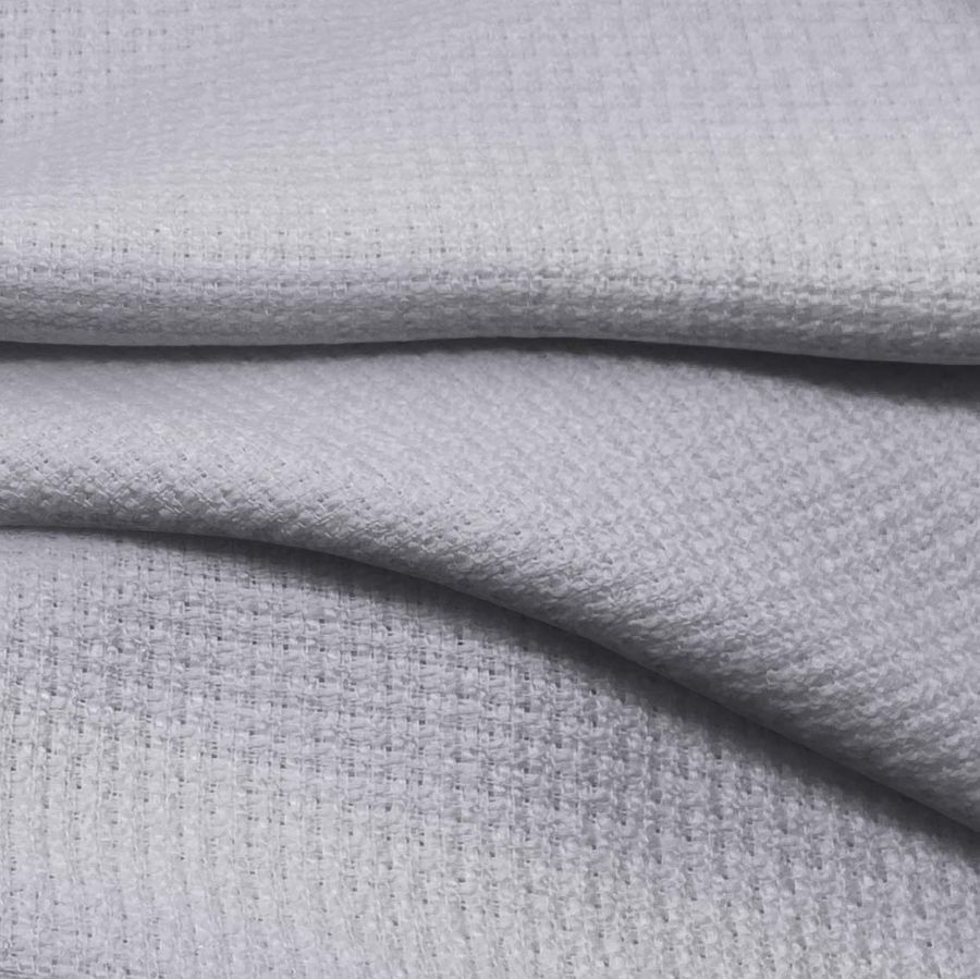 La tela base de esta prenda es un Tweed - Chanel compuesto al 100% por POLIÉSTER con un gramaje de 420 gr/m2 y un ancho de 150 cm. El color liso impreso es gris-lavanda con una tinta cyan del 27, tinta magenta del 21, tinta yellow del 13 y tinta black del 0, y el CMYK correspondiente es 27 21 13 0. Este color secundario transmite una sensación de calma y equilibrio, y su combinación armoniza con colores como el rosa, el amarillo pastel o el crudo.