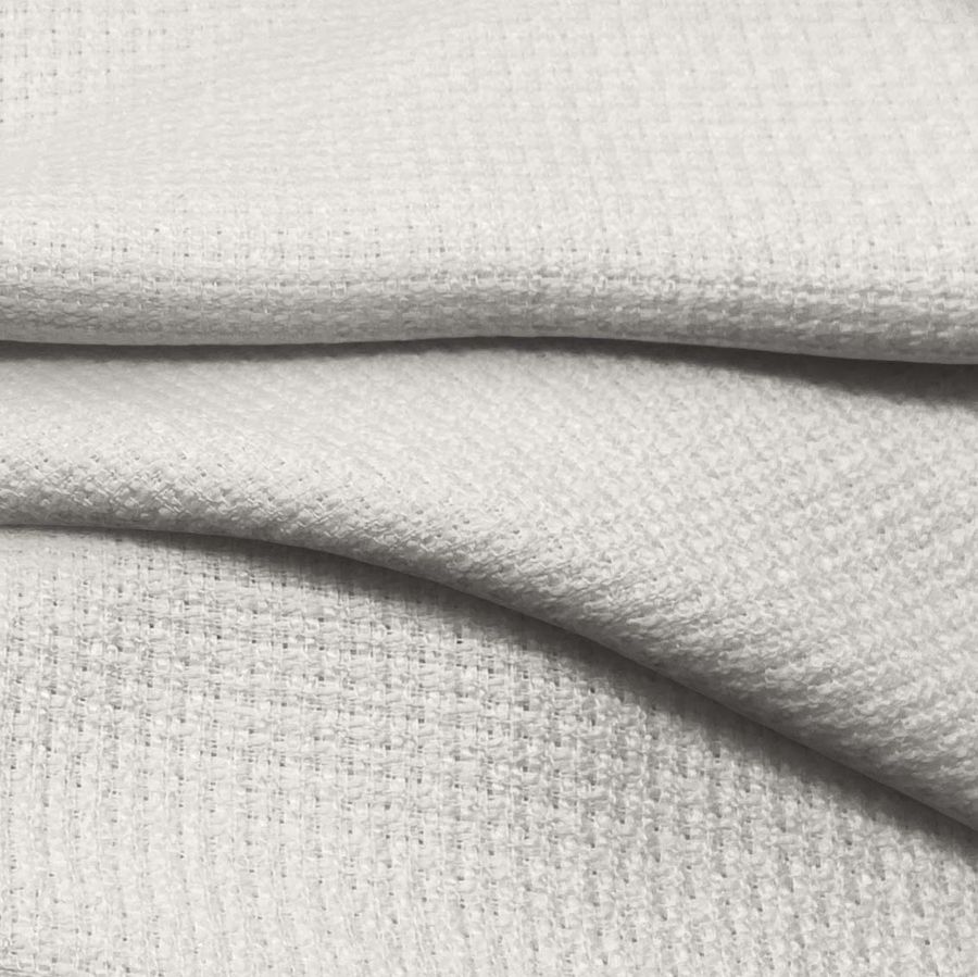 La tela base de este producto es el Tweed Chanel, compuesta al 100% de poliéster, con un gramaje de 420 gr/m2 y un ancho de 150 cm. El color liso impreso es un blanco con toques florales, cuyo CMYK es 0 2 7 0. La mezcla de cian, magenta y amarillo en distintas proporciones y la ausencia de tinta negra dan como resultado un color suave y delicado, con un toque de elegancia primaveral. Este color combina muy bien con tonos pastel y tierras, y puede resaltar con complementos negros o dorados.