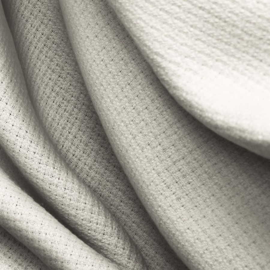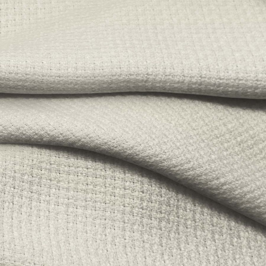 La tela base es Tweed - Chanel, compuesta al 100% por poliéster, con un gramaje de 420 gr/m2 y un ancho de 150 cm. El color liso impreso es Blanco-Cáscara de huevo, con valores de 7 en tinta Cyan, 7 en tinta Magenta, 19 en tinta Yellow y 0 en tinta Black, dando como resultado un CMYK de 7 7 19 0. Este color transmite una sensación de suavidad y ligereza, similar a la cáscara de huevo. Combina especialmente bien con colores pasteles, como rosas y lilas, y también con tonos más oscuros, como el marrón.