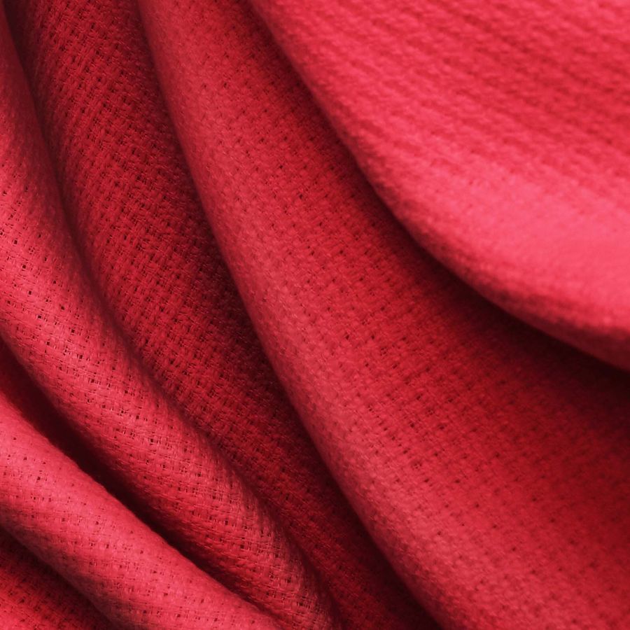 La tela base es el Tweed - Chanel, un tejido de poliéster con un gramaje de 420 gr/m2 y un ancho de 150 cm. El color liso impreso es un Rojo Bermellón de China, con un CMYK de 20 99 85 13. Este color es intenso y vibrante, con un fuerte carácter que evoca pasión, vitalidad y fuerza. Su combinación con el color negro y neutros como el blanco o el beige, puede ser muy elegante y sofisticada. La tela base está impresa con el color liso a una sola cara por impresión digital textil que asegura una excelente calidad en la impresión.