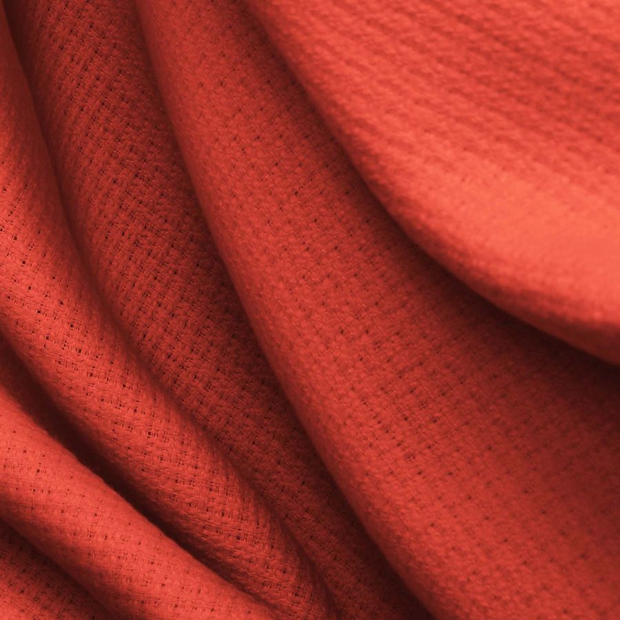 La tela base de este tejido es Tweed - Chanel, compuesta al 100% de poliéster, con un gramaje de 420 gr/m2 y un ancho de 150 cm. El color liso impreso es Rojo Cinabrio, con una mezcla de tintas cyan (3), magenta (85), yellow (80) y black (0) que resulta en un CMYK de 3 85 80 0. Este color secundario es intenso, vibrante y con cierto matiz anaranjado que lo hace único. Combina especialmente bien con colores neutros como el blanco, gris y negro, pero también con tonos más cálidos como el naranja y el marrón.