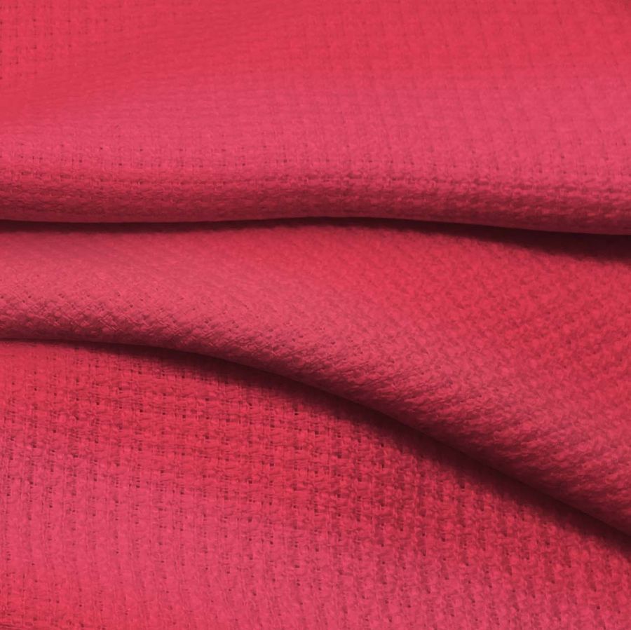 La tela base de esta referencia es el Tweed - Chanel, compuesta por 100% poliéster, con un gramaje de 420 gr/m2 y un ancho de 150 cm. El color liso impreso, Rojo Deseo, se produce con la tecnología de sublimación y su CMYK es 0 87 56 0. Este color es simbólico de la pasión, la energía y la fuerza, a la vez que también se relaciona con la calidez y la elegancia.
