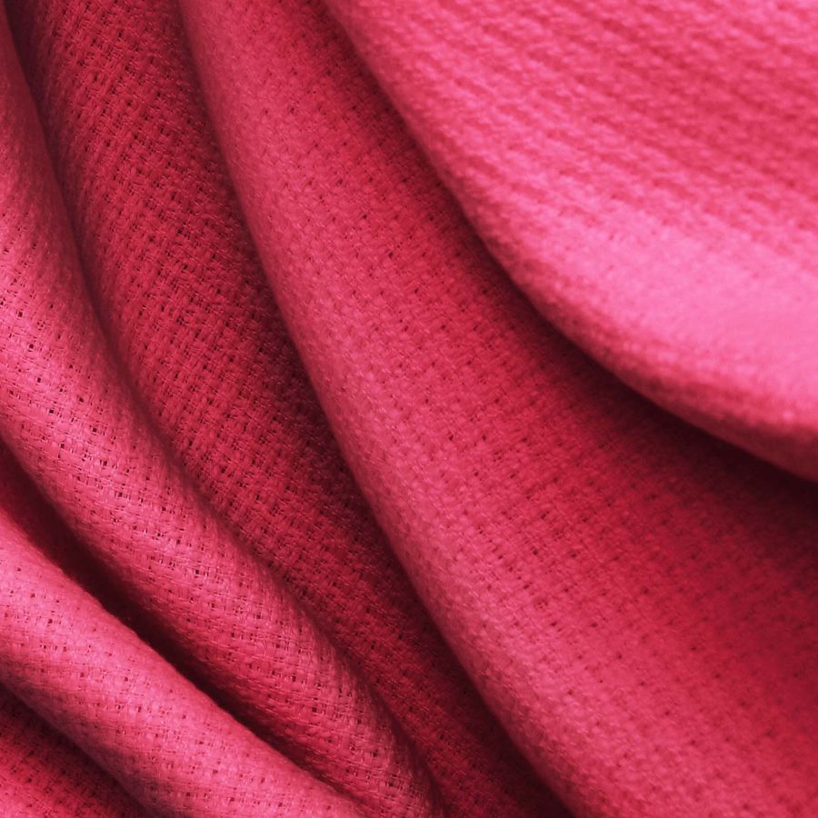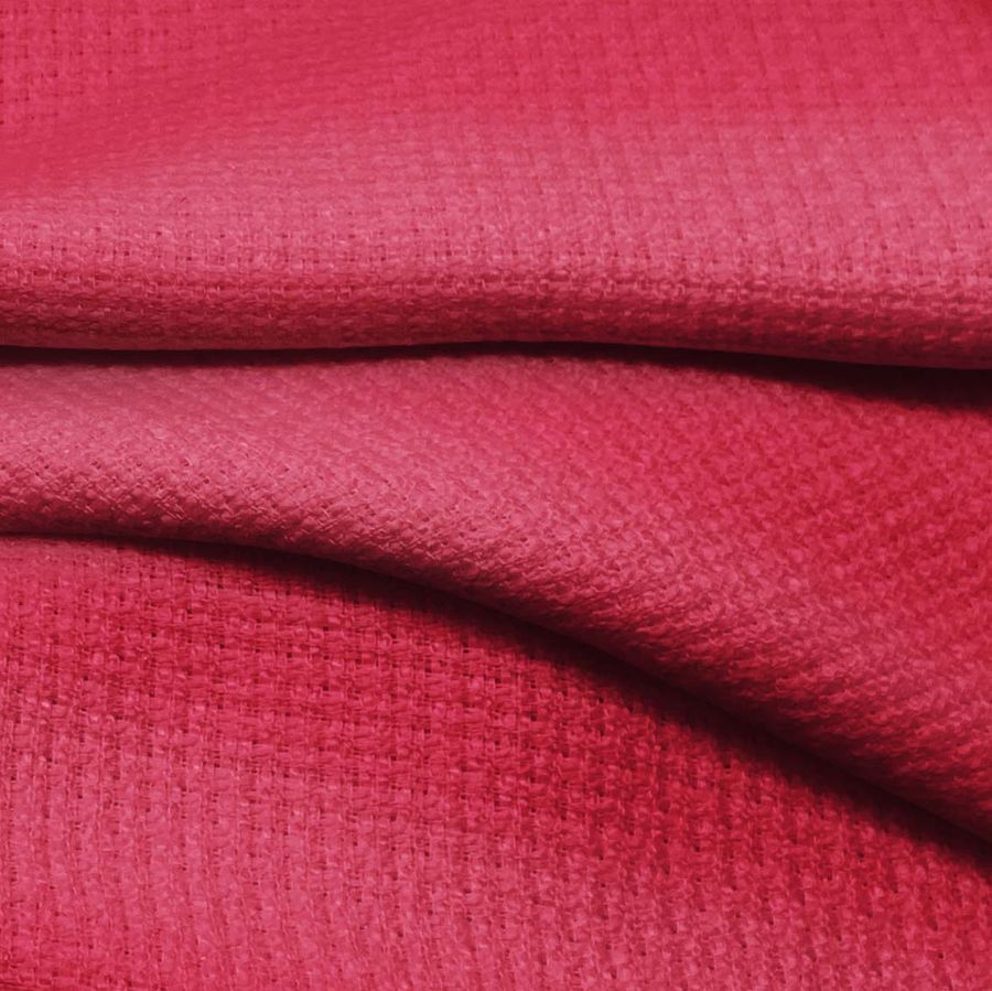 La tela base es un Tweed - Chanel 100% poliéster, con un gramaje de 420 gr/m2 y un ancho de 150 cm. El color liso impreso es un rojo frambuesa francés, con una composición de tintas de 15 cyan, 93 magenta, 60 yellow y 5 black, representado por su perfil CMYK de 15 93 60 5. Este color es vibrante y atrevido, ofreciendo un toque de elegancia y sofisticación. Además, combina bien con otros tonos oscuros de rojos y pinks. Este tejido está impreso con el color liso a una sola cara por impresión digital textil, lo que significa que es un tejido impreso, y no tintado.