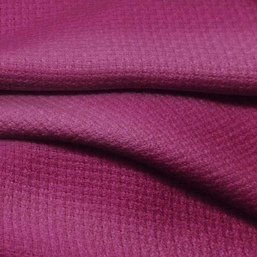 La tela base del tejido es el Tweed - Chanel, con una composición 100% polyester y un gramaje de 420 gr/m2. El color liso impreso sobre ella es de un hermoso tono de rojo frambuesa oscuro, con una tinta cyan de 40, una tinta magenta de 93, una tinta yellow de 30 y una tinta black de 26. El CMYK del color impreso es de 40 93 30 26. Este color secundario es impactante por su intensidad, brinda una sensación de luminosidad y profundidad, y combina perfectamente con colores tierra, marrones, dorados y tonos beige.