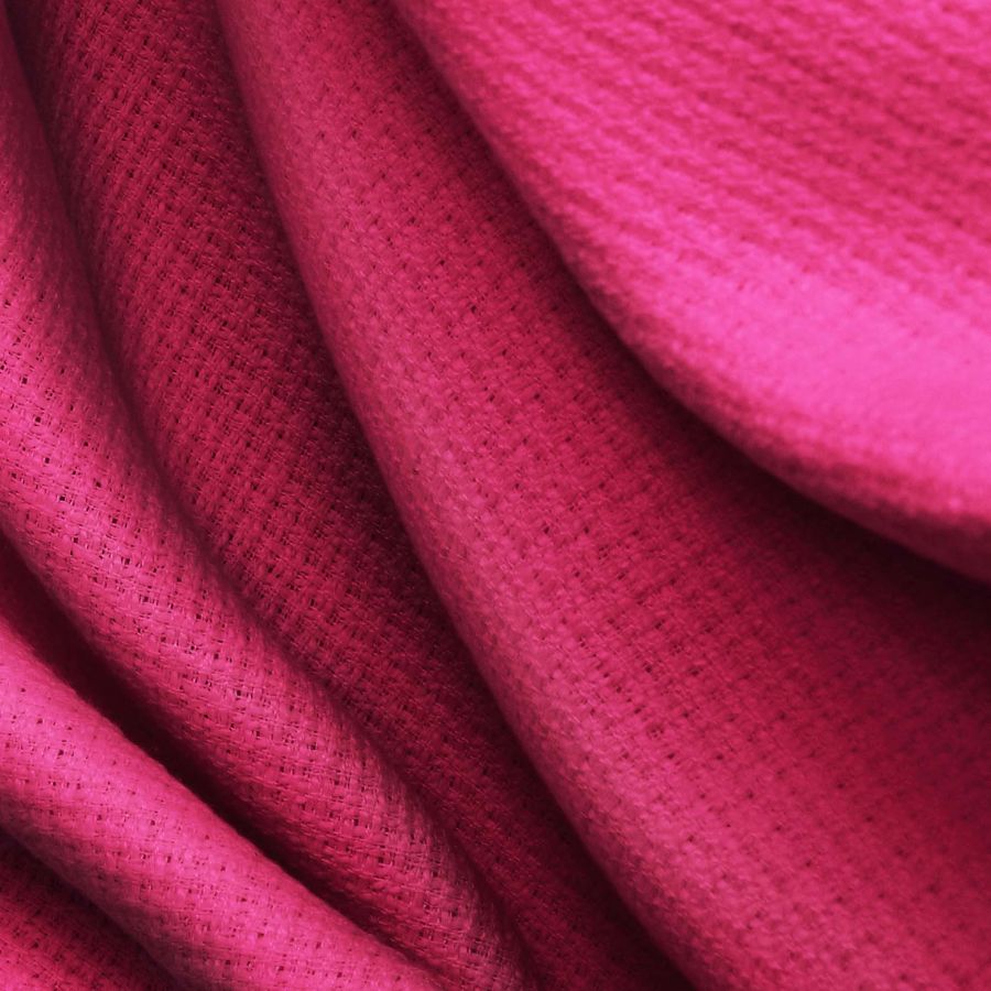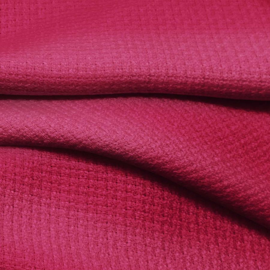 La tela base del tejido es Tweed-Chanel, con una composición del 100% de poliéster, un gramaje de 420 gr/m2 y un ancho de 150 cm. El color liso impreso en la tela es rojo-granate, con un CMYK de 23 98 52 17, lo que le da un tono rico y profundo. Este color secundario es una combinación de rojo intenso y matices de marrón oscuro, lo que le da a la tela un aspecto elegante y sofisticado. Se combina muy bien con tonos neutros como el negro, gris y blanco, así como con tonos más cálidos como el dorado y el beige.
