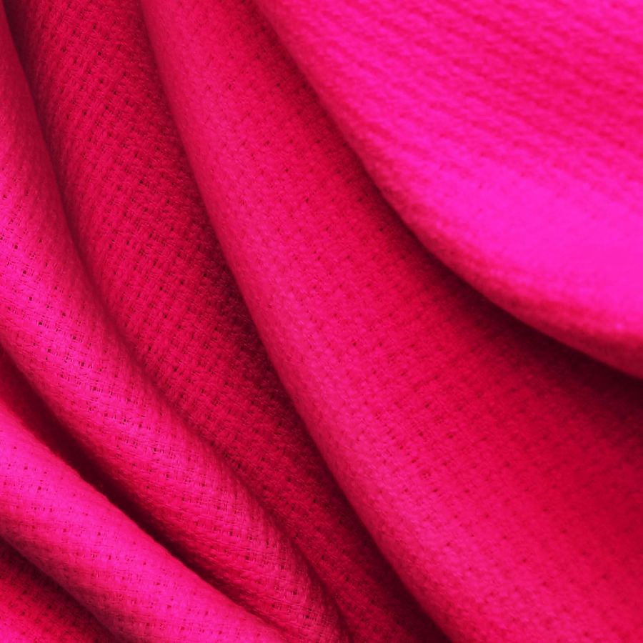 La tela base es Tweed - Chanel, de tipo tweed y composición 100% poliéster, con un gramaje de 420 gr/m2 y ancho de 150 cm. El color liso impreso es Rojo, con una tinta magenta del 95%, yellow 50% y black 0%, lo que indica un tono rojo intenso con un ligero matiz rosado y un nivel medio de brillo. Este color se combina perfectamente con tonos neutros como el blanco, beige, gris y negro, además de con tonos verdes y morados.