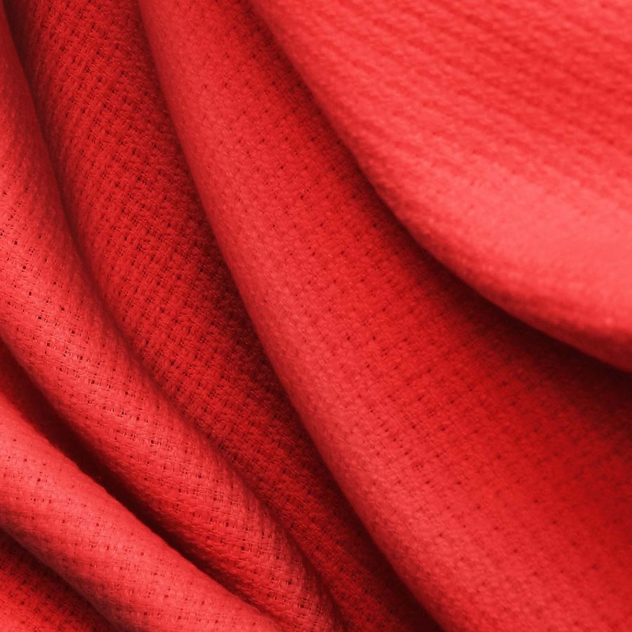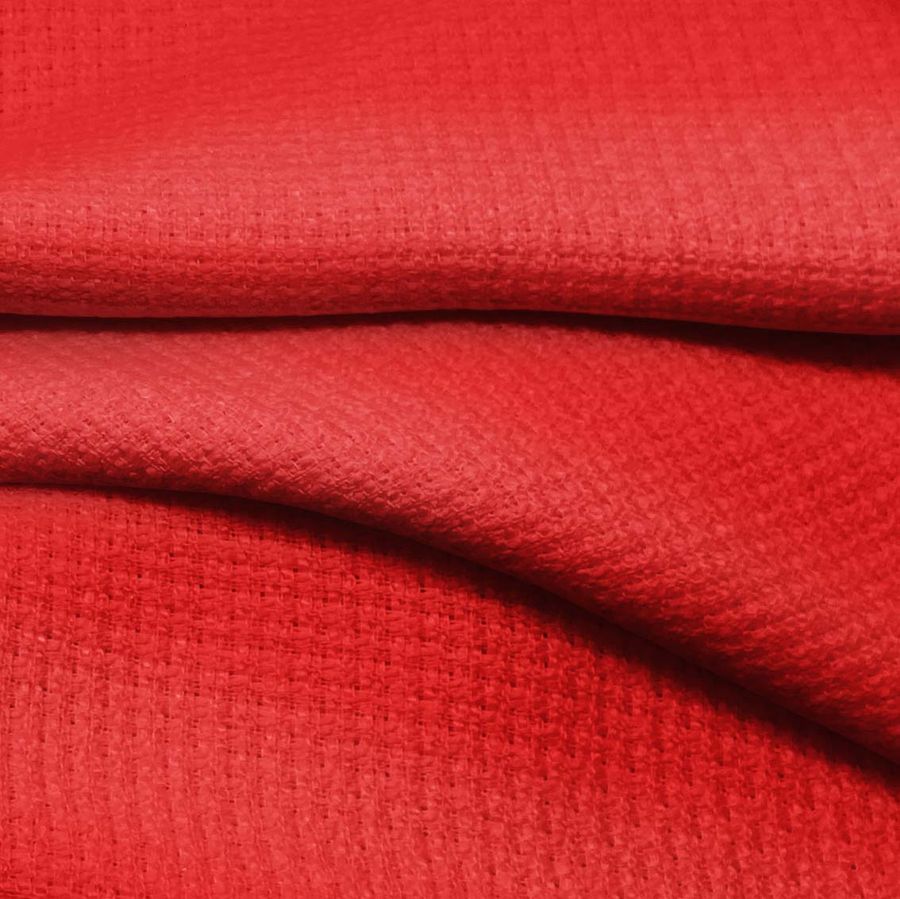 La tela base es el Tweed - Chanel, compuesta al 100% de poliéster en un gramaje de 420 gr/m2 y un ancho de 150 cm. El color liso impreso en este tejido es el Rojo Lujuria, con una combinación de cian 0, magenta 95, amarillo 90 y negro 0 en CMYK. Este color es un rojo intenso y seductor, simbolizando la pasión y la emoción. Se combina particularmente bien con tonos neutros como el gris y el blanco, así como con tonos naturales como el beige y el marrón.