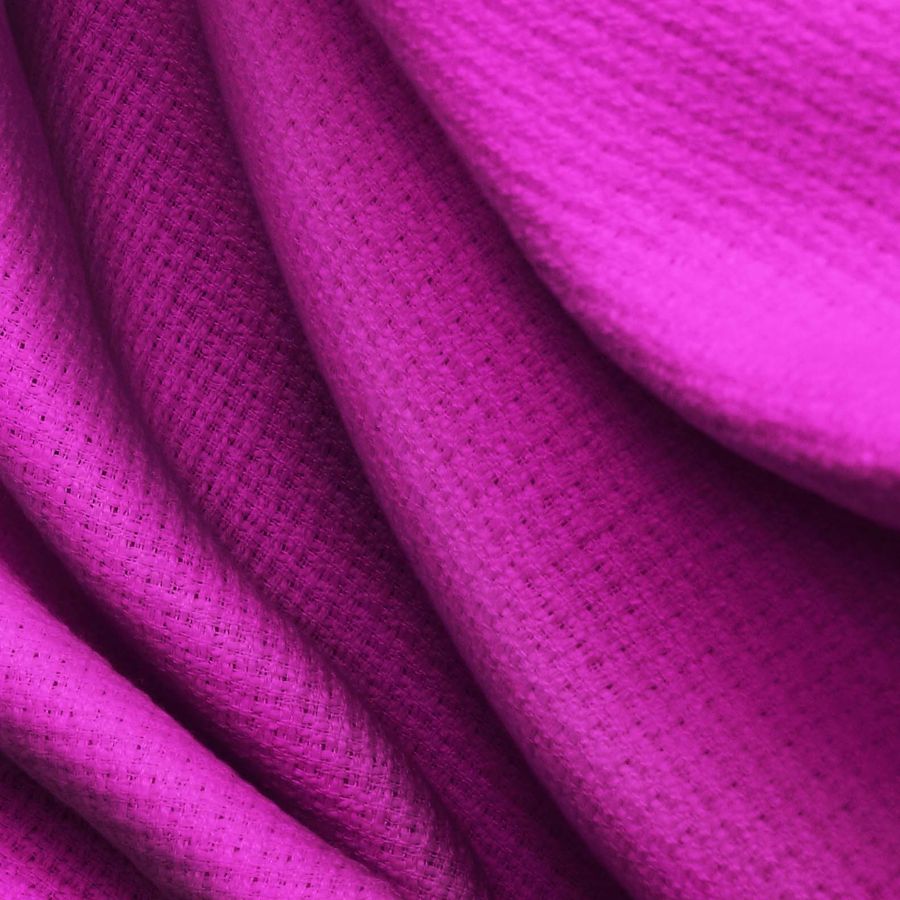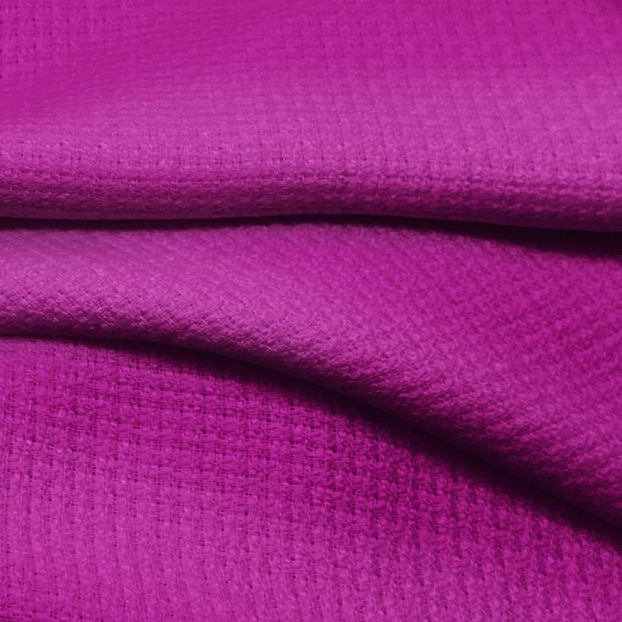 La tela base es un Tweed - Chanel compuesta 100% de POLIÉSTER con un gramaje de 420 gr/m2 y un ancho de 150 cm. El color liso impreso en esta tela es una mezcla de Rojo y Púrpura Rojizo con un CMYK de 44 100 2 0. Este color secundario se describe como un tono pasional y místico, simbolizando la pasión, la creatividad y el poder. Combina muy bien con tonos dorados, beige, gris, blanco y negro para crear un contraste equilibrado y sofisticado. Es importante destacar que la tela está impresa con el color liso a una sola cara por impresión digital textil, lo que significa que el reverso de la tela es blanco.