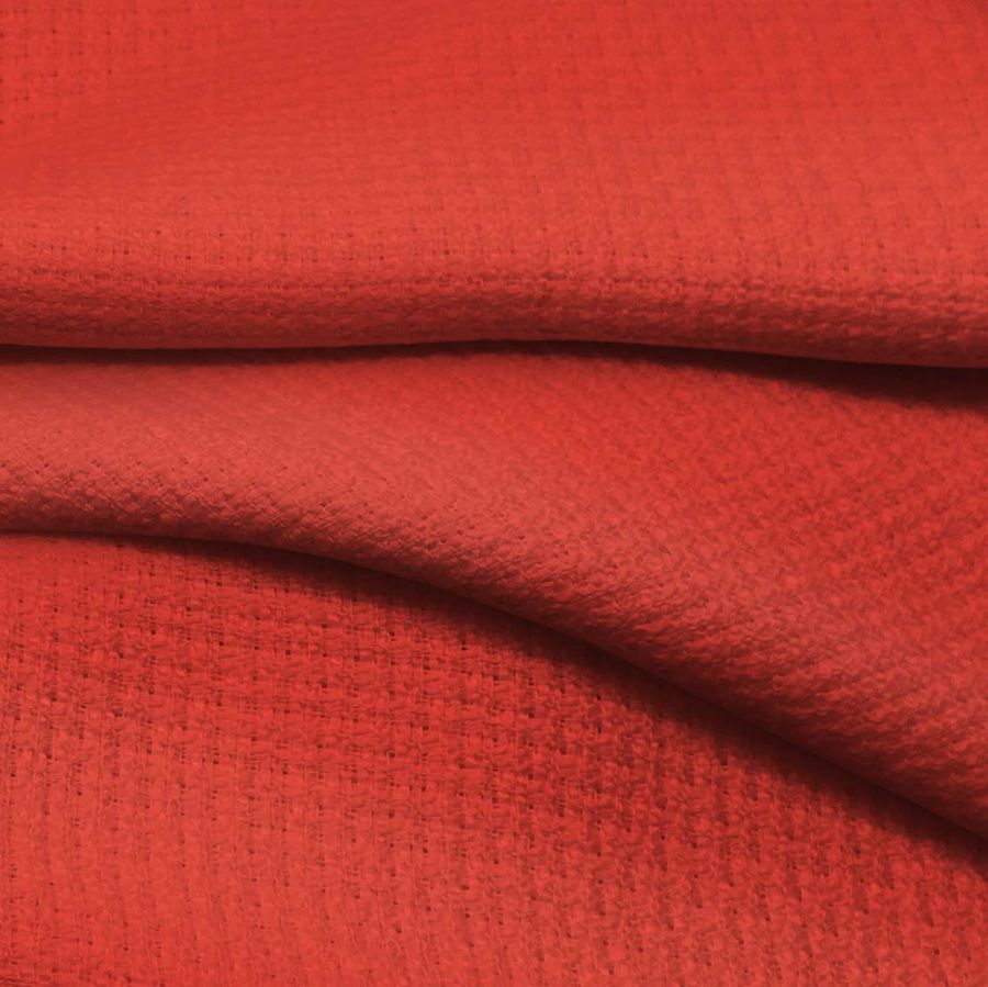 La tela base es un tweed de poliéster de 420 gr/m2, con un ancho de 150 cm. El color liso impreso es rojo con un CMYK de 5 87 82 0 (rojo CG). Este color evoca emociones de pasión y energía, pero también puede transmitir elegancia dependiendo de las combinaciones de colores. Combina muy bien con tonos neutros como el blanco o negro, así como con tonos más vibrantes como el rosa o el naranja.