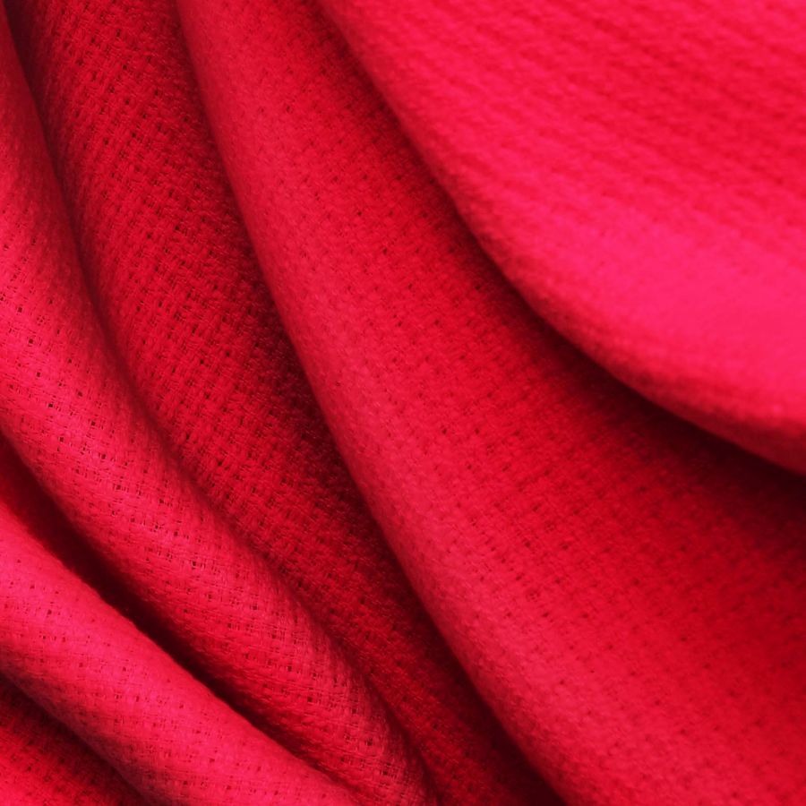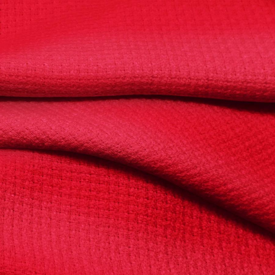 La tela base de esta prenda es Tweed - Chanel, compuesta por 100% poliéster con un gramaje de 420 gr/m2 y un ancho de 150 cm. El color liso impreso es Rojo de Cadmio, con una tinta cyan del 1%, magenta del 100%, yellow del 89% y black del 0%. Su CMYK es 1 100 89 0, obteniendo un tono rojo intenso y vibrante.