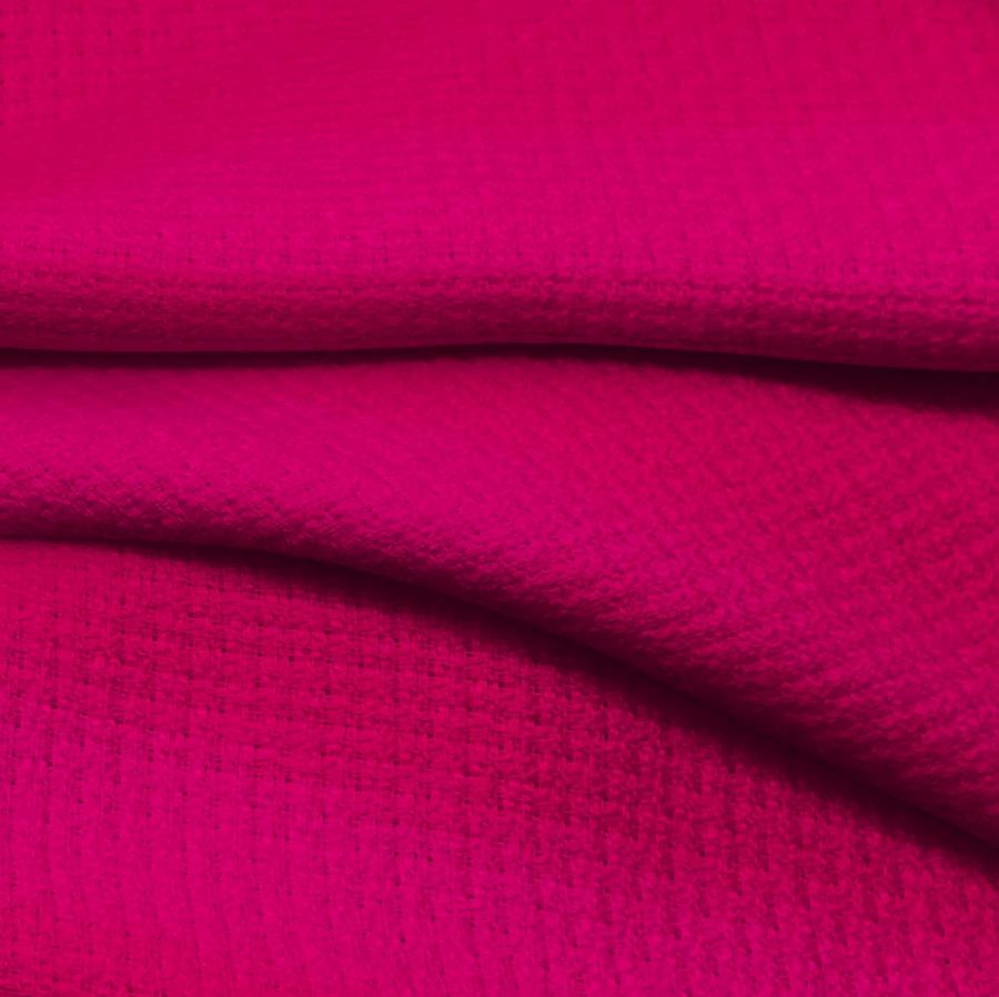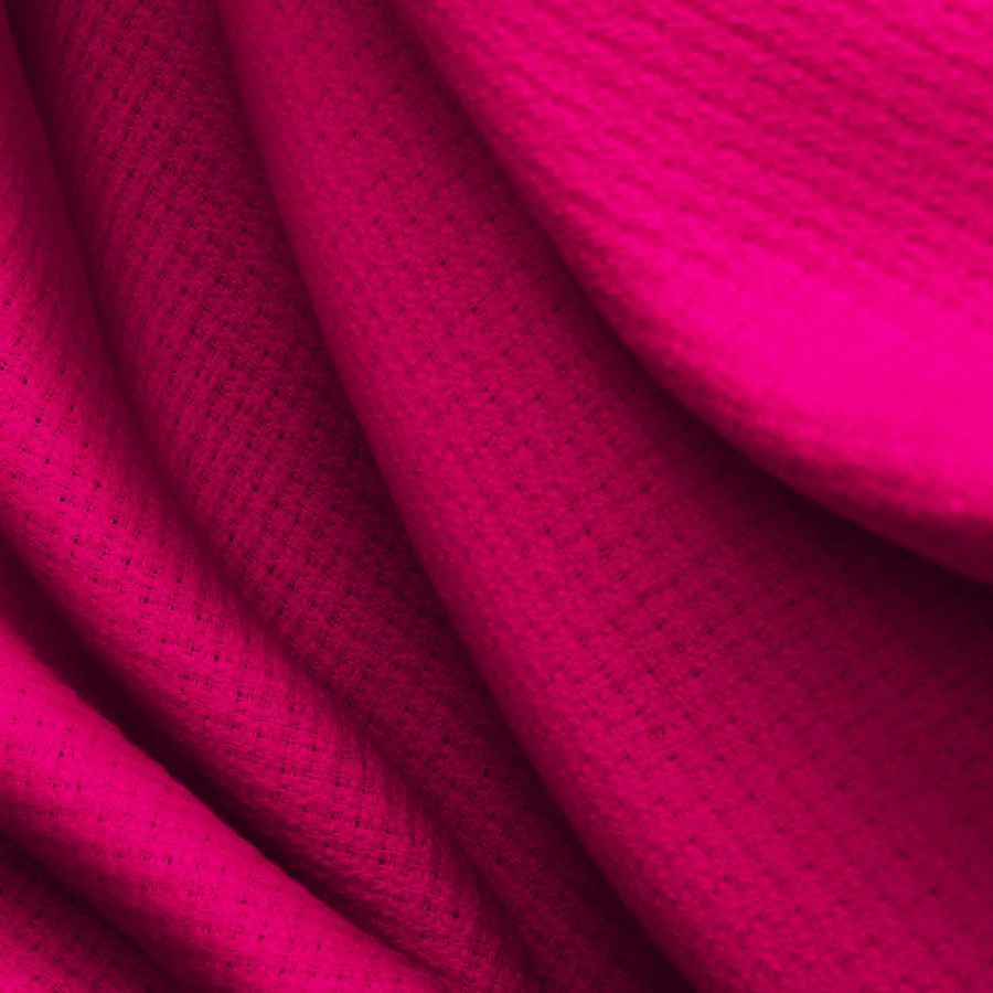La tela base es un tweed Chanel 100% POLIÉSTER, con un gramaje de 420 gr/m2 y un ancho de 150 cm. El color liso impreso en esta tela es Rojo Rubine, con valores de CMYK de 11 100 42 3. Este color es un rojo intenso y brillante, que refleja pasión, energía y vitalidad. En la simbología de los colores, el rojo representa la fuerza y la pasión, y el Rubine aporta luminosidad y brillo. Este color combina muy bien con tonos neutros, como el blanco y el negro, así como con tonos dorados y plateados.