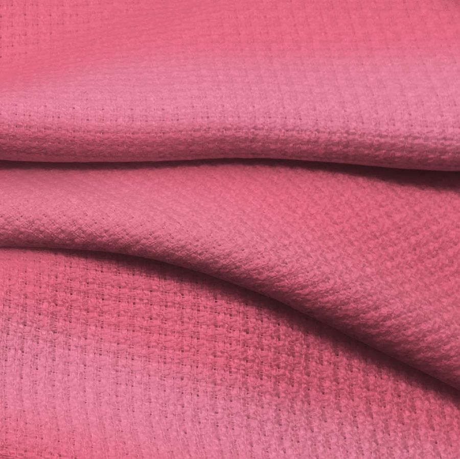 La tela base del tweed Chanel es un tejido de poliéster con un gramaje de 420 gr/m2 y un ancho de 150 cm. Es de textura rígida, lo que le otorga un aspecto elegante y sofisticado. El color liso impreso es rojo sandía, que se obtiene mediante la tecnología de sublimación. El CMYK del color es 0 70 29 0, lo que indica la presencia de un alto contenido de magenta. El color sandía simboliza la vitalidad y la pasión, siendo una elección perfecta para prendas de alta costura y accesorios. Combina especialmente bien con tonos neutros, como el blanco, el negro y el gris, así como con tonos amarillos y verdes.