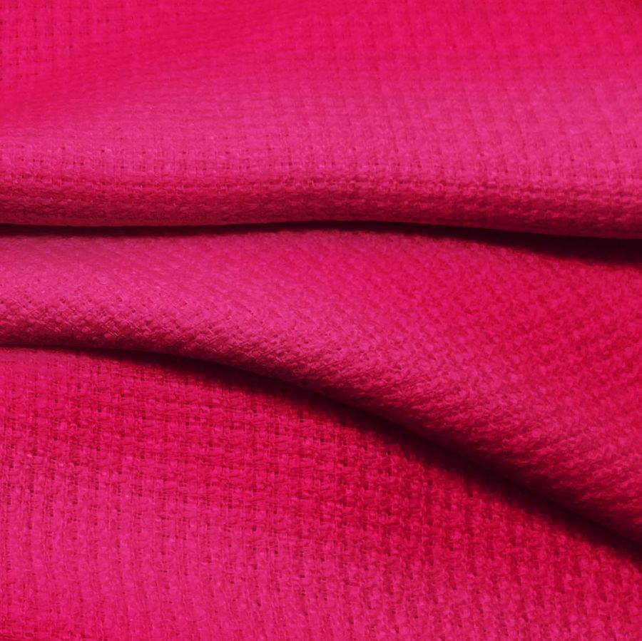 El Tweed Chanel es una tela compuesta al 100% de poliéster con un gramaje de 420 gr/m2 y un ancho de 150 cm. La tela en sí misma tiene una textura rígida y dura. El color rojo impreso en dicha tela se logra mediante la tecnología de impresión digital textil, con una tinta de CMYK 7-100-53-1. El resultado es un color rojo intenso y vibrante que es perfecto para crear prendas de moda llamativas.