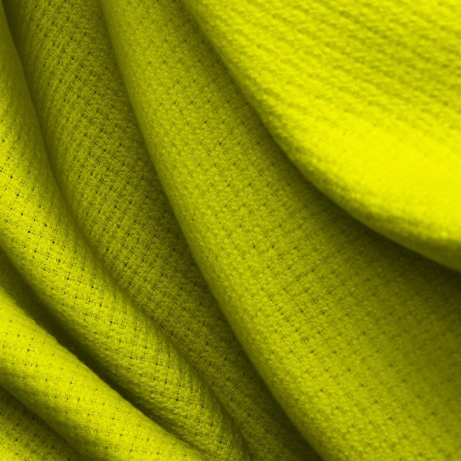 La tela base es el Tweed - Chanel, un tejido de tweed compuesto al 100% por poliéster, con un gramaje de 420 gr/m2 y un ancho de 150 cm. El color liso impreso es verde con un toque de amarillo, con un perfil CMYK de 31 4 98 0. Este tipo de tejido se imprime con el color liso en una sola cara por impresión digital textil.